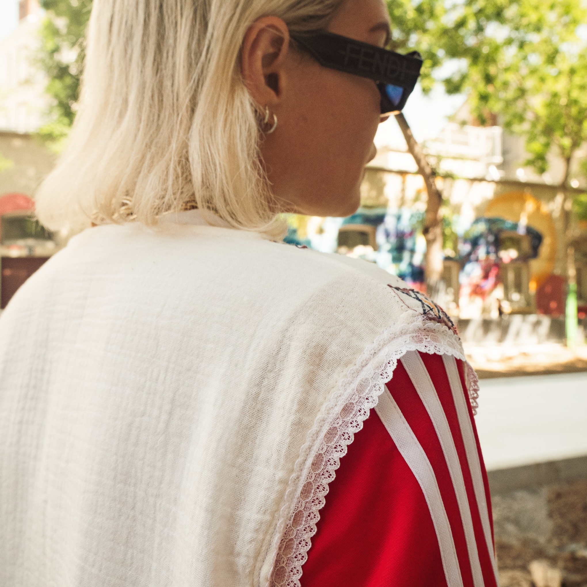 Gilet brodé Adidas revisité. Il est agrémenté de dentelle tout autour des bras au niveau des épaules. Ses manches évasées apportent une touche bohème et gracieuse.
