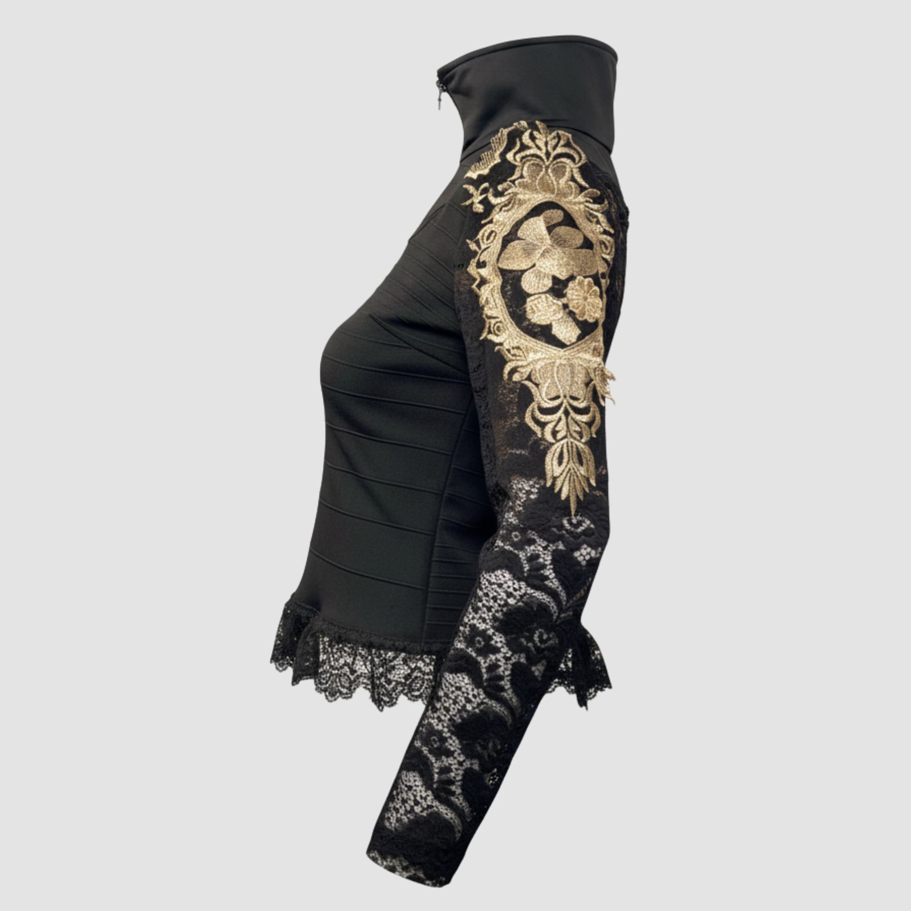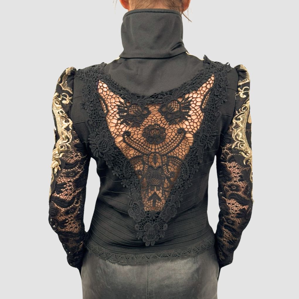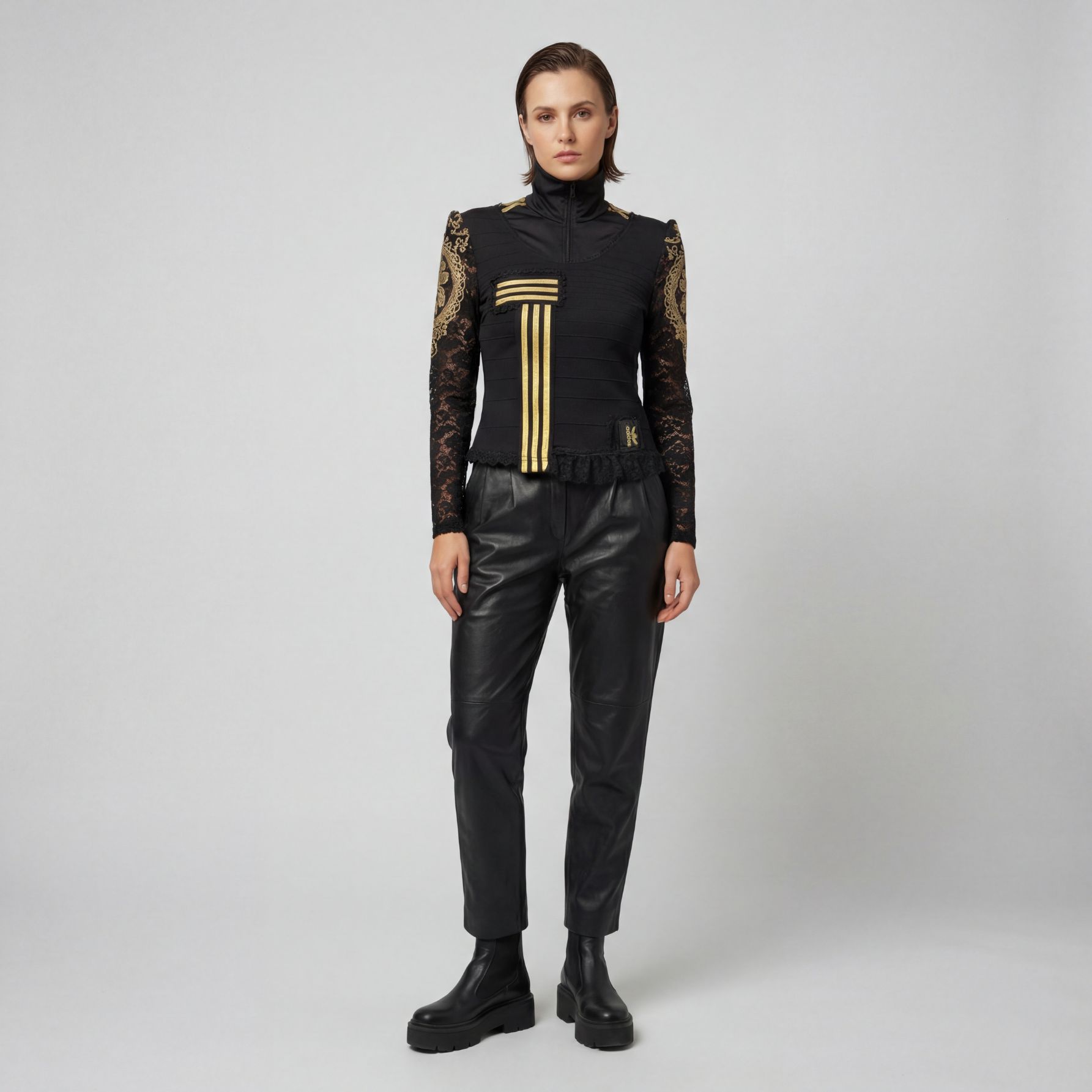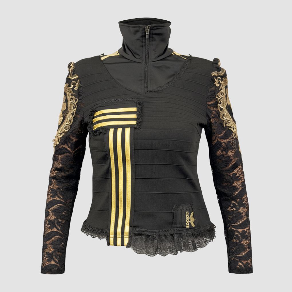 Top Adidas revisité avec finitions en dentelle noire et dorée. Dos transparent en dentelle.