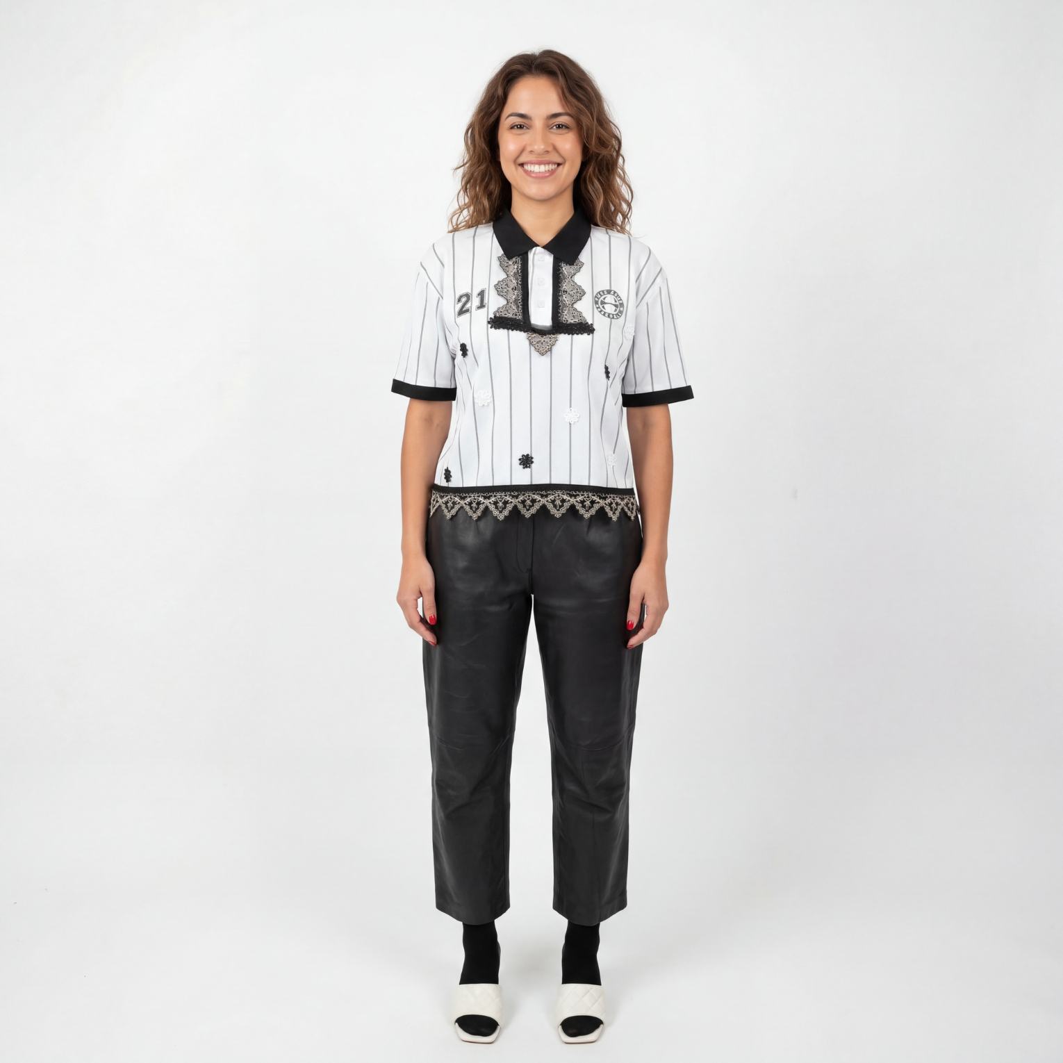 Maillot gardien de but retro reworked avec de la dentelle noire et dorée, fleurs brodées. Ce tee shirt convient à des personnes de taille S / M – selon si tu souhaites un look plus ou moins oversize.