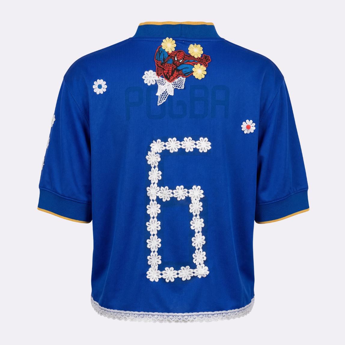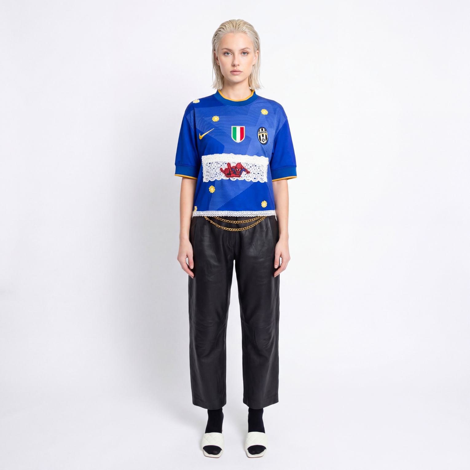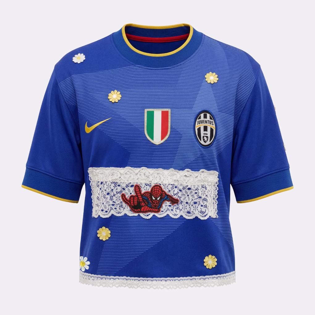 Maillot Juventus x Spider-Man upcyclé avec dentelles et fleurs.