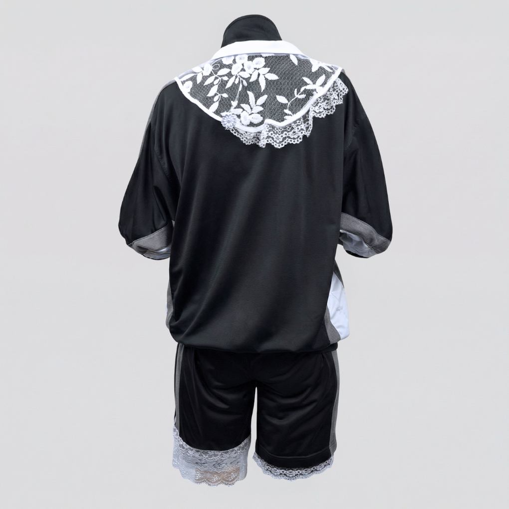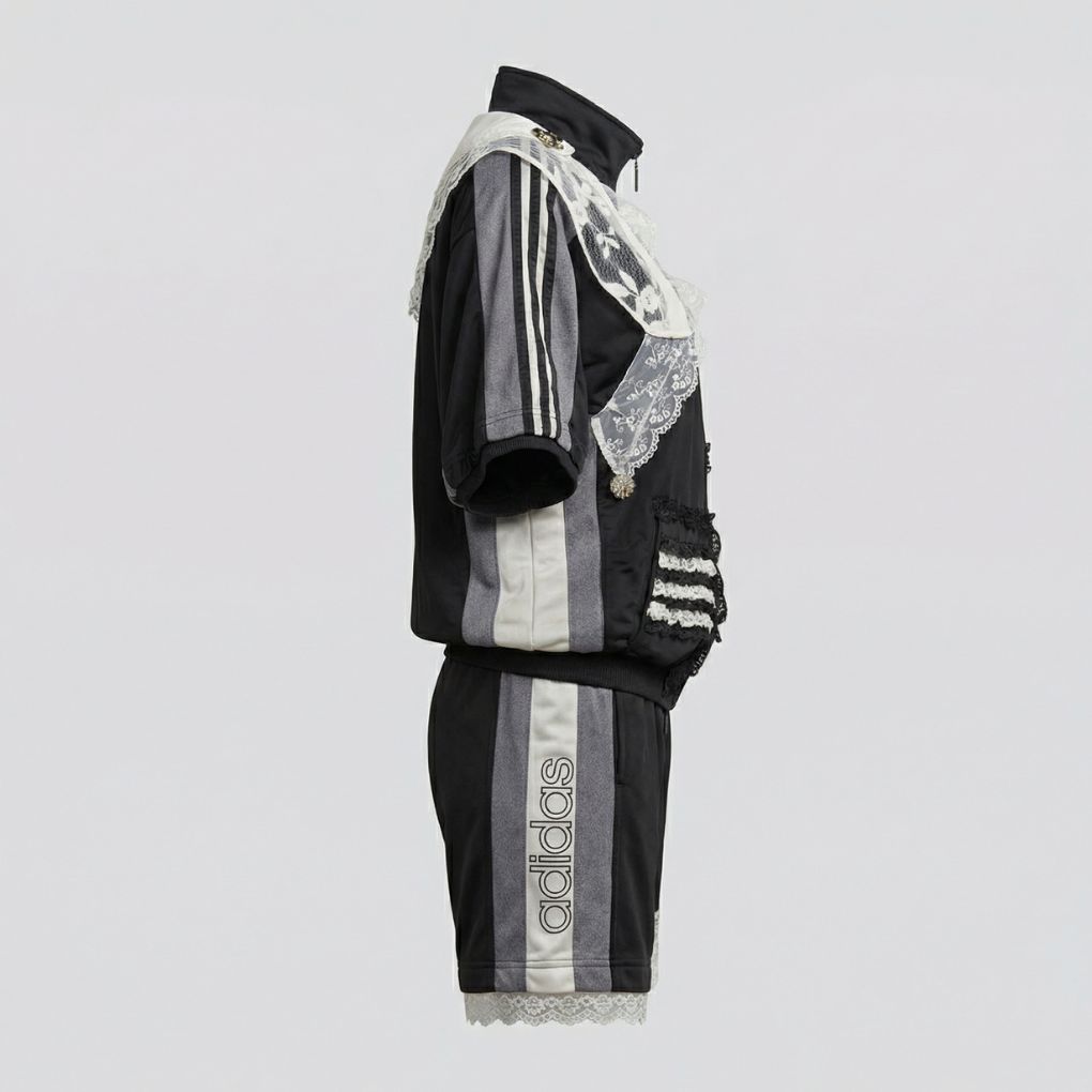 Ensemble Adidas vintage revisité, composé d’un short et d’une veste à manches courtes. La veste comprend un faux-col blanc entièrement apparent déstructuré, avec des pierres fantaisies.