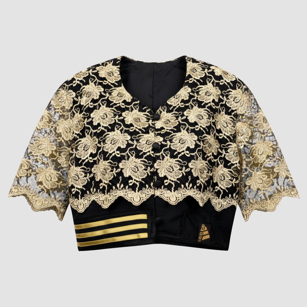 Veste de tailleur courte Adidas reworked avec de la dentelle dorée.