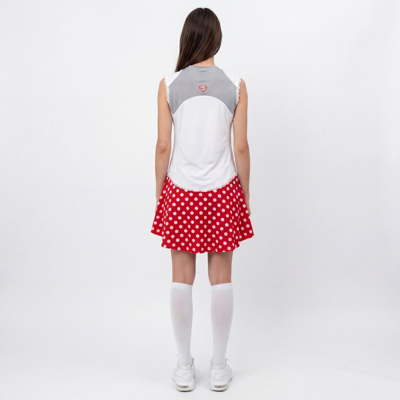 Robe à virgule jupe patineuse destructurée rouge à gros pois blancs.