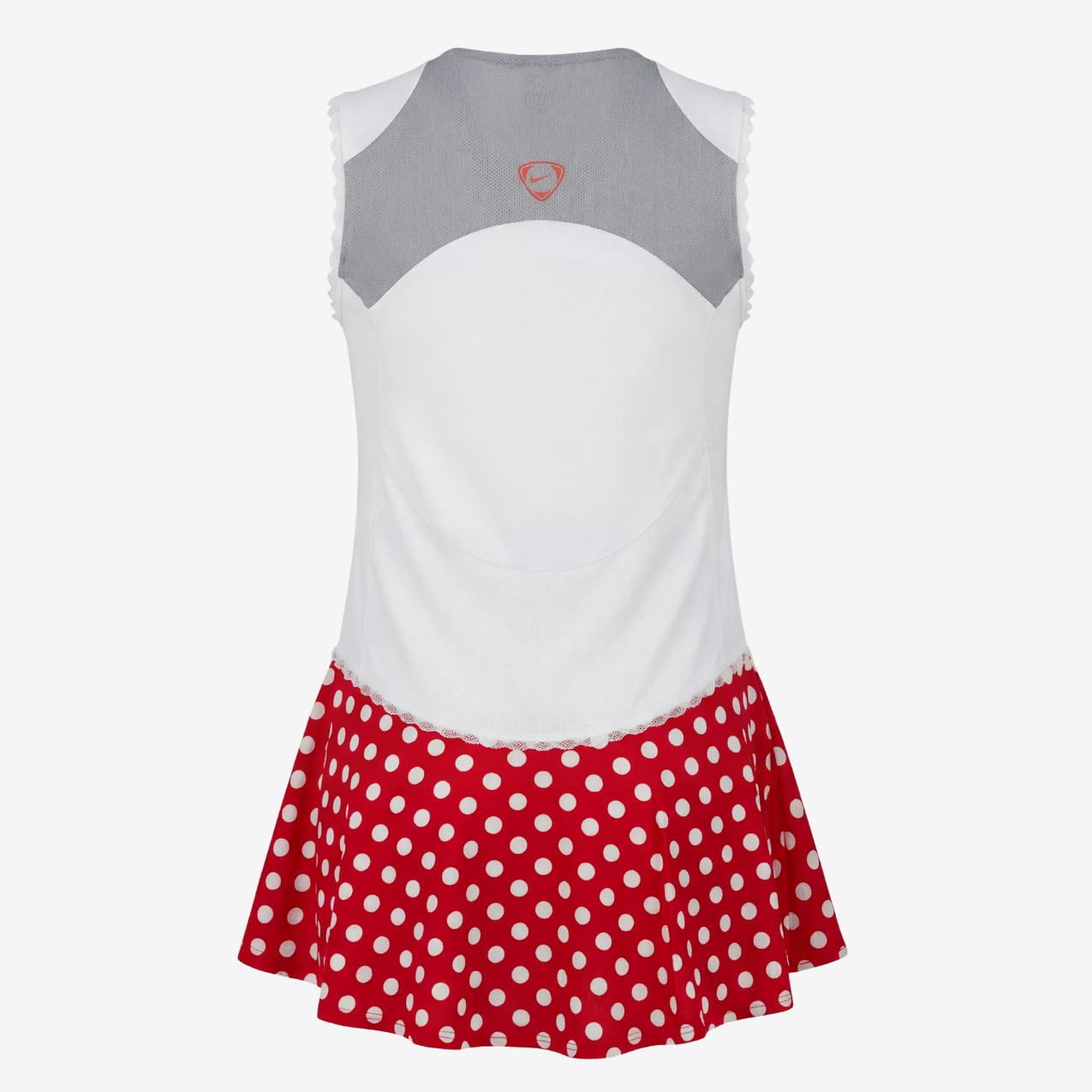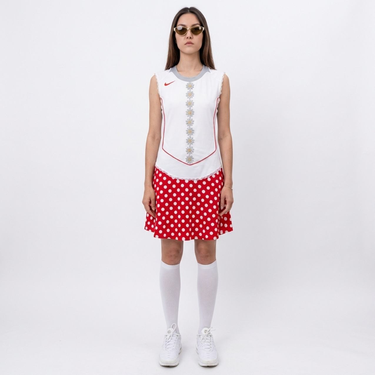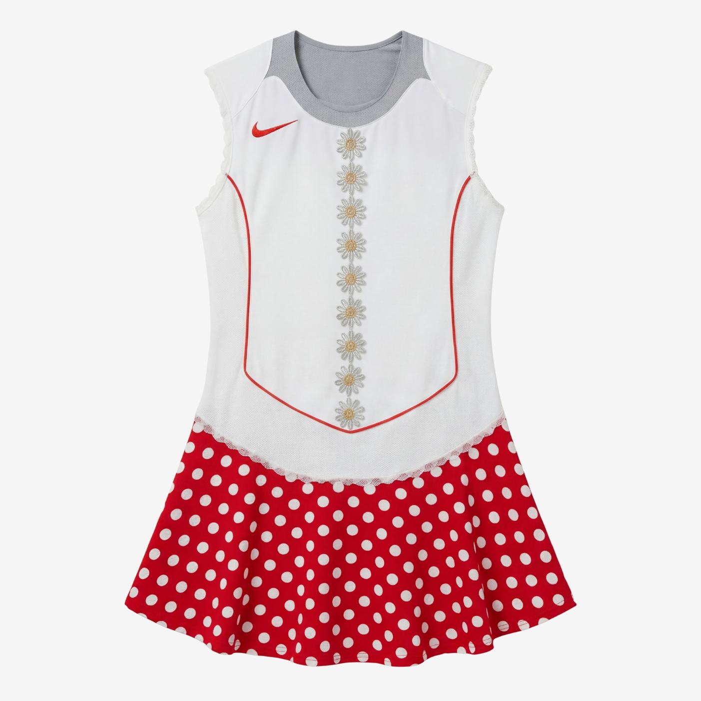 Robe à virgule jupe patineuse rouge à gros pois blancs inspiration années ’60. Détails : dentelles blanches et fleurs Argent / Or.